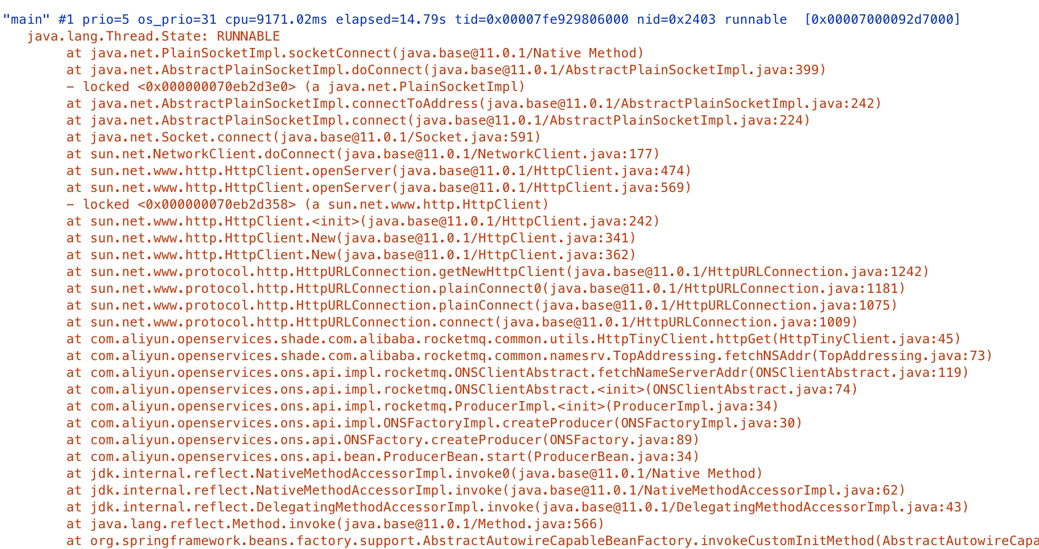 业务中用到了阿里云的ONS服务,开发中相同配置的情况下,在外网环境(mac开发机)上与阿里云ecs服务器上,服务启动时间相差巨大 (11.124 seconds与23.863 seconds的差距,相差接近10秒),查看日志并没有发现任何error出现,但是有一个奇怪的现象是,就是在外网环境启动时,两条日志记录的间隔时间也差不多是10秒左右。